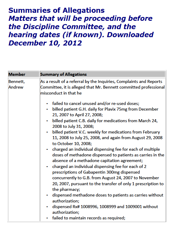 Summaries of Allegations – Ontario College of Pharmacists Dec.10.2012 – Click Here