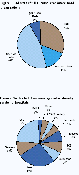 Several types of firms provide IT outsourcing services to the healthcare industry, including systems integrators, HIT software vendors, consulting firms and hospital owned firms. Perot Systems has the largest piece of the full IT outsourcing market based on the number of hospitals outsourced, followed by CSC and Siemens. The "other" category includes ACS (non-Superior), Capgemini, InfoHealth Management, Phoenix Health Systems and SAIC (see Figure 2).