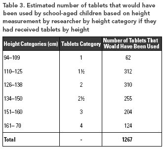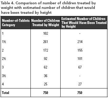 The relationship between the heights and weights of these children as measured by the distributors was determined using the Pearson statistical test to obtain correlation coefficient values. The number of tablets the distributors administered to the children was compared with what would have been used had dosage been based on height. The data were entered and analyzed using Epi Info software Version 6.04 (Centre for Disease Control and Prevention, Atlanta, Georgia, USA).