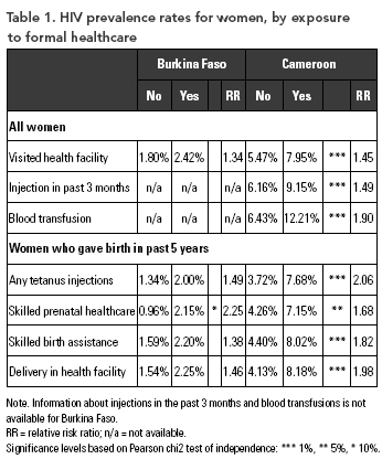Table 1 shows that HIV prevalence rates are higher for women who have been in contact with the formal healthcare system. HIV prevalence rates are considerably higher in Cameroon; however, the relative risk ratios (RR) are similar in Burkina Faso and Cameroon, indicating that HIV prevalence rates are 34% to 125% higher for women who were in contact with the formal healthcare sector.