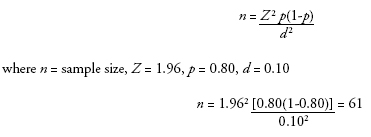 A sample size of 61 but approximated to 64 was calculated using the table for a minimum sample size estimate for a population survey with 95% confidence interval (Lemeshow et al. 1990). The sample size was calculated using the formula: