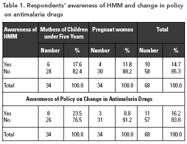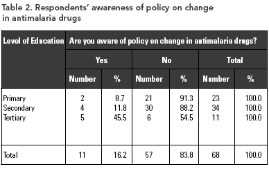 Table 1 shows that only 14.7% and 16.2% of respondents were aware of the home management of malaria (HMM) program (17.6% of mothers of children under five years vs. 11.8% of pregnant women) and the change in policy on malaria treatment using antimalarials (23.5% of mothers of children under five years vs. 8.8% of pregnant women) respectively. Conversely, 85.3% and 83.8% were not aware of the HMM program and change in policy on malaria treatment. Statistical tests using ANOVA showed that more of the respondents who knew about HMM were younger, with a mean age of 23.3 years, compared with 26.7 years for those who did not know about HMM (p < .05). The respondents' level of education had a direct association with their awareness of the change in antimalaria drug policy, as presented in Table 2 (χ2 = 8.39, df = 2, p < .05).
