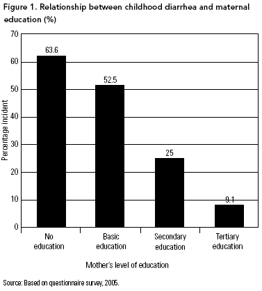 Of the children covered in the survey, 38% had had diarrhea in the 2 weeks preceding the interview, while only 6% had diarrhea on the day of the interview. Analysis of survey data (Figure 1) showed that children of mothers who had never been to school had approximately seven times as many cases of diarrhea compared with children whose mothers had received tertiary education (F = 6.67, p = 0.03). The association between childhood diarrhea and maternal education in the Tamale Metropolitan Area agrees with the findings of other studies in Ghana (Benneh et al. 1993; Tagoe 1995; Boadi and Kuitunen 2005) and other parts of West Africa (Togunde 1999). It has been argued elsewhere that the relationship between maternal education and childhood diarrhea is equally influenced by household wealth (Osumanu 2007).