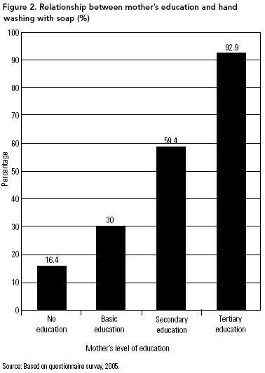 How mothers wash their hands depends on the kind of dirtiness. For perceived, contaminating and religious dirtiness, "clean" water alone or, in a few cases, clean water with soap, is used. For social dirtiness, "clean" water alone is considered adequate. Mothers usually dry their hands on their clothes. They may also, in a few instances, use nappies or any available material. The differences regarding mothers' hand washing behaviours becomes larger when looking at habits of washing hands with soap and water. Since hand-washing habits are related to a mother's knowledge of the links between hygiene and health, hand washing with soap is largely dependent on the educational attainment of the mother which, in turn, is also influenced by a household's ability to afford soap. Figure 2 shows the relationship between hand washing with soap and educational attainment of the mother. This finding is consistent with earlier ones from other parts of the country (Benneh et al. 1993; Gyimah 2003; Boadi and Kuitunen 2005).