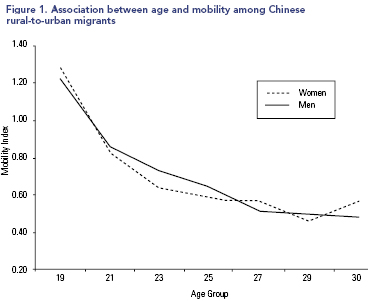 As shown in Table 1, respondents had an average migration history of 4.29 years (SD = 3.05). More than half (58%) had migrated to two or more cities and 30% had migrated to three or more cities. There was no gender difference in the mobility index between genders (mobility index = 0.76 for women versus 0.72 for men). While men tended to move more frequently than women did from one city to another (e.g., 67% men versus 46% women had migrated to two or more cities, p < .01), men also had a longer migratory history than women did (4.84 years versus 3.48 years, p < .01). As shown in Figure 1, the mobility index significantly differed by age, with younger migrants being more mobile. In addition, the mobility index differed by marital status with those migrants who had never been married being more mobile than those who were married (0.83 versus 0.52, p < .0001). The association between mobility index and marital status was consistent across gender (e.g., the mobility index was 0.83 for unmarried women and 0.53 for married women; 0.83 for unmarried men and 0.51 for married men).