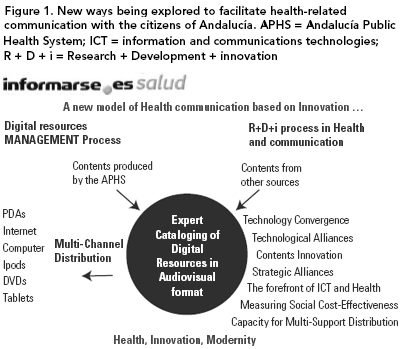 Since the end of the 1990s, Andalucía's e-health strategy has been based on integrating all the health information on each citizen and making this information available at any time or any place in which the citizen requires health assistance. The strategy is influenced by the regional government's innovation and modernization vision to create higher levels of health, welfare and economic progress for Andalucía. The public health system is committed to converting knowledge into new technologies, new services and processes of added value. The healthcare innovation concept is, "To transform the accumulated knowledge within the different channels of the Andalucía Public Health System into new processes, services and technologies in order to improve healthcare quality; to make the system more accessible and personalized for the citizen and also to create better opportunities for professional development for its employees."The strategy manifests itself in a wide array of new innovation initiatives including the Expectations and Participation Bank of the health system, which is a web-based instrument to capture citizens' expectations of their healthcare system. VirSSPA (virtual reality in clinical practice) is a software package that supplies surgeons with an infrastructure and set of tools, based on virtual reality, with which to plan and simulate head and neck surgical interventions. Its goals are to reduce the time taken in the operating theatre, tiredness and possible lack of concentration in healthcare professionals. It expects to increase success rate in surgical operations by avoiding certain risks due to improvisation. Figure 1 reflects the variety of new ways that are being explored to facilitate health-related communication with the citizens of Andalucía.