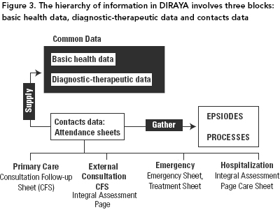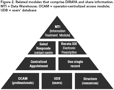 DIRAYA also has a data warehouse (MTI) and decision support system; it started in 2001, when it provided third- and fourth-level services to 130 operators (strategic and logistic managerial staff). It was extended to 350 local level managerial staff (second level) and 10,000 operational clinical providers of the first level in 2004.