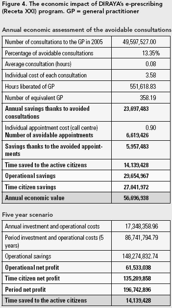 For providers, the system minimizes prescription activity in health centres, releases personnel from bureaucratic tasks, increases time devoted to patients and provides decision support for prescribing. For pharmacists, it enhances their ability to provide pharmaceutical care and reduces the time needed for the management expenses and prescription billing. For health administrators, it improves follow-up and control of rational use of drugs, monitors the correct assignment of responsibility in the rational use of drugs, provides increase alerts and drug surveillance programs and decreases fraud through better control of billings. Figure 4 presents an analysis of the economic impact of the Receta XXI program.