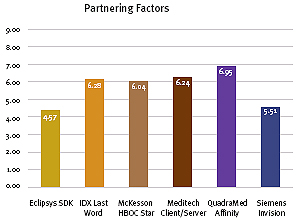 The data was gathered from healthcare professionals representing a total of 553 facilities: 45 facilities with QuadraMed Affinity, 34 facilities with Meditech Client/Server (many more using the MAGIC version), 115 facilities with IDX LastWord, 174 facilities with McKessonHBOC Star, 148 facilities with Siemens Invision, and 37 facilities with Eclipsys SDK. KLAS selected three groupings "Partnering," "Quality," and "Business Indicators" from which to report the measurement points relating to these areas. For the purpose of this report only 22 of the 38 measurement points from the KLAS evaluation are used.