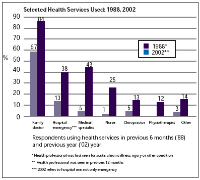The databases are based on roughly similar questions about the use of health services. In 1988, respondents were asked whom they first saw about their chronic or acute illness or condition, or their injury in the previous six months. In 2002, as part of The Monitor's on-going tracking of health-service use, respondents were asked whom they had seen in the previous 12 months.