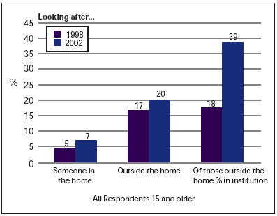 Another, more dramatic, change is the surge in the proportion of Canadians who are providing informal care to at least one person living in an institution. In 1998, 18% of those providing informal care outside the home reported that at least one of those they helped lived in a nursing home, home for the aged or other form of special housing. By 2002, that proportion has more than doubled to 39% of those providing informal care to someone outside the home.