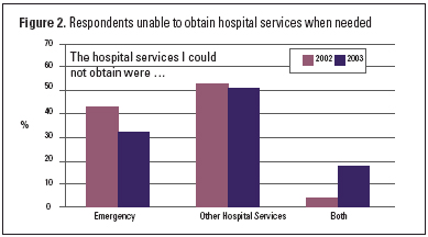 Access to Health Services When Needed; Situation Shifts in Hospitals. The percentage of health service users who reported they were unable to obtain health services when they needed them in the past year decreased slightly to 16% from 18% in 2002. Of this group, only 36% reported they were unable to access hospital services, compared to 44% a year ago.