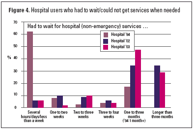 Hospital waiting times improve (at the long end). The overall pattern since 1994 is unmistakable. More non- ER hospital patients are waiting much longer for services. In 1994, the majority of these patients waited less than a week for services. Today, the majority waits longer than a month. The good news is there may be a decrease in the percentage waiting longer than three months. It has dropped from 34% to 29% of hospital users (unfortunately, the drop is not statistically significant).
