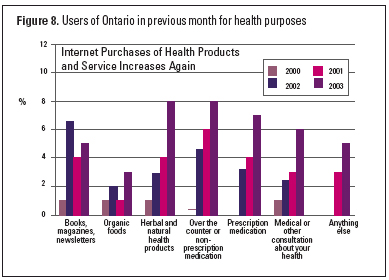 Seven percent of Internet users for health purposes in the previous month reported they had purchased prescription medication over the Net, compared to 4% last year. Similarly, purchases of non-prescription medications over the Net have increased to 10%.