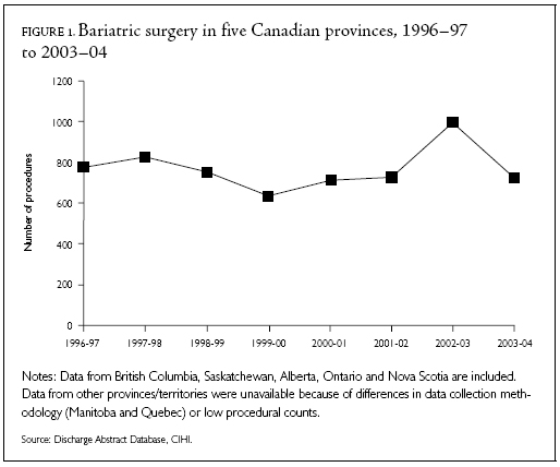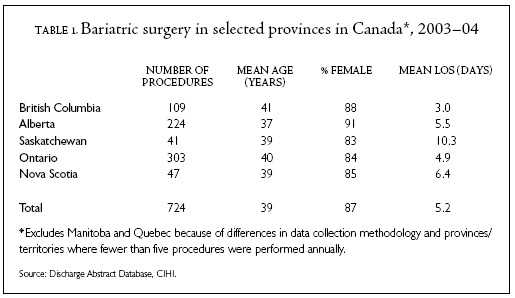 Obesity rates for Canadian adults are much higher today than in the past, raising questions about how to achieve healthy weights and mitigate the associated health risks. While not a solution at the population level, bariatric surgery may be a treatment option for a relatively small proportion of obese individuals. In Canada, unlike in the United States, no consistent trend was evident in the use of this surgery between 1996-97 and 2003-04 across the five provinces for which comparable data were available. In 2003-04, bariatric surgeries were performed predominantly for women (87%); the average length of stay in hospital was 5 days; and 1.4% of patients were readmitted to hospital within 7 days of their discharge after surgery.