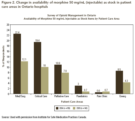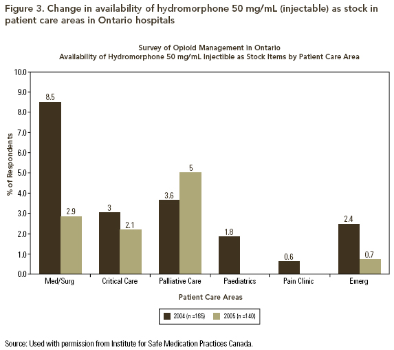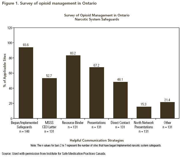 A survey based on known best practices for handling of opioids was developed to assess the current management of these medications in Ontario hospitals. The five-page survey was electronically distributed by the Ontario Hospital Association to every Ontario hospital in January and February 2004. Responses were submitted online or via fax to ISMP Canada. Seventy-five percent of Ontario hospitals (165) responded to the baseline survey. Results indicated that there were opportunities to implement system changes to reduce risks associated with opioid use.