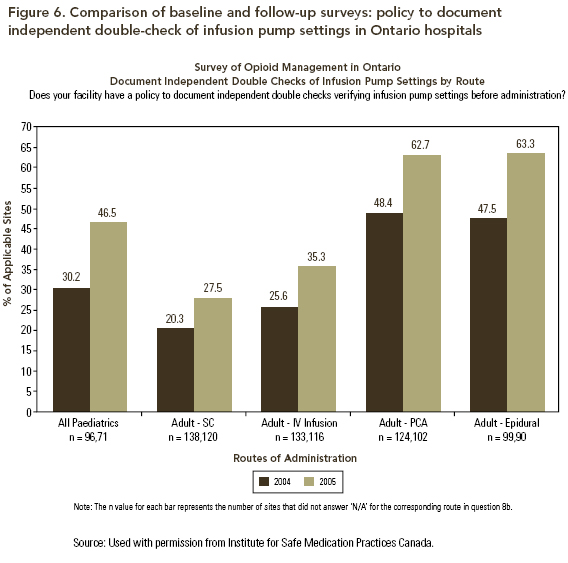 Another priority recommendation for Ontario hospitals is the implementation of independent double-checks (IDCs) for patient-controlled analgesia (PCA) infusion pumps. The working definition of a non-automated IDC is "a process in which a second practitioner conducts an individual verification" (Institute for Safe Medication Practices Canada 2005). Information and strategies for IDCs are based on human factors engineering principles, and practical examples are included in the resource binder. For example, a report of a usability test for an IDC process and a checklist for a PCA infusion pump are provided. The survey results indicate that Ontario hospitals are implementing IDCs with PCA and other infusion pumps (Figure 6).