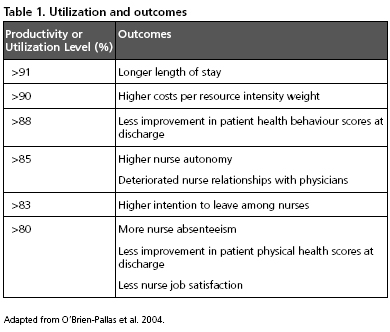In the study of cardiac and cardiovascular nurses, patient, nurse and system outcomes declined as nursing units became understaffed. Nurse staffing level was measured at the unit level as patient workload divided by nurse worked hours. Although this formula is the traditional definition of productivity for the Canadian Institute of Health Information (CIHI), it is more accurately termed a measure of utilization. The utilization level is an index of how well a unit is staffed relative to patients' care needs. Consistent with the Management Information System (MIS) guidelines (CIHI 1999), the maximum work capacity (i.e., utilization) of any employee is 93% because 7% is allocated to paid breaks during which time no work is contractually expected. At 93%, nurses are working flat out with no flexibility to meet unanticipated demands or rapidly changing patient acuity. Specific utilization cut points were determined based on patient workload and nurse worked hours (Table 1; O'Brien-Pallas et al. 2004). This study demonstrated that significant benefits, both fiscal and human, can be achieved by moderating productivity or utilization levels within a range of 85%, plus or minus 5% (O'Brien-Pallas et al. 2004). As we develop the next-generation workload systems, these types of parameters can be validated across a variety of settings and could serve as the mathematical estimates to be used when evaluating the workload.