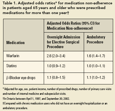 In two separate studies, scientists at the Institute for Clinical Evaluative Sciences (ICES) evaluated the unintended discontinuation of long-term medications in hospitalized patients with chronic diseases. The first study tracked over 233,000 Ontarians aged 65 years and older, with continuous use (one or more years) of warfarin (blood thinner), statins (cholesterol-lowering drugs) or betablocker eye drops between April 1, 1997, and September 30, 2002. Patients were assessed for continuation of the drug after overnight hospitalization for uncomplicated elective surgery. Warfarin is usually discontinued prior to surgery because of an increased risk of bleeding. In contrast, statins and eye drops do not have to be stopped before surgery.Those with an overnight hospitalization for elective surgeries were compared with those who had ambulatory or outpatient procedures, as well as with a control group who had no procedures. Patients prescribed warfarin were more than twice as likely to discontinue their drug after an overnight hospitalization for elective surgery, and more than one and a half times more likely to discontinue their drug after an ambulatory procedure, than those who had no procedures (Table 1). Undergoing a procedure did not affect the risk of unintended discontinuation of statins or eye drops.