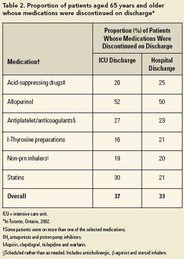 The second study reviewed the hospital records of consecutive ICU patients at one academic and two community hospitals in Toronto during 2002. ICU patients who were prescribed at least one of six types of medications to treat chronic conditions before hospitalization were identified to determine the proportion of patients whose medications were unintentionally discontinued at hospital discharge (Table 2).