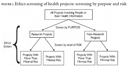 - For the purposes of screening, first screen projects according to purpose: For the purposes of the ethical review of projects involving people or their health information, it is helpful to distinguish projects by their primary purpose. If the purpose is to contribute to the growing body of knowledge regarding health and/or health systems that is generally accessible through standard search procedures of academic literature, then the investigation is best classified as research. If the project is something other than this, then the project is best classified as non-research (Q/E).