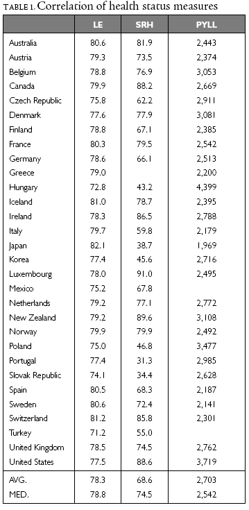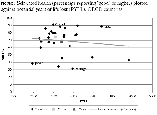 But as in everything else, differences that are subtle across our southern border become much larger when one looks farther across the world. Table 1 shows SRH from the countries of the OECD (2006), represented by the proportion of the population surveyed that report their health as "excellent," "very good" or "good." This is matched with two measures of mortality, (crude) life expectancy at birth (both male and female) and potential years of life lost (PYLL) due to premature death.2 Figures 1 and 2 plot each country's SRH against the actual mortality experience, and show mean and median values.