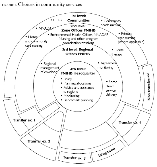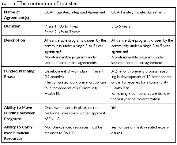 In 1994, FNIHB broadened opportunities for community control by introducing the Integrated Community-based approach (Health Canada [FNIHB] 1999b). The intent was to provide flexible alternatives to the one-size-fits-all transfer model. Table 1 shows the main differences between the two models. Although the integrated model provided somewhat less flexibility, some bands, especially in Alberta, preferred this model because they believed that this option did not infringe on their treaty rights. Some communities have been concerned that the transfer process pushes communities to accepting a model that simply side-steps more important discussions of treaty rights in areas of health (Culhane Speck 1989; Favel-King 1993). Others saw it as lower risk and as an opportunity to learn to manage health services before entering into a transfer agreement. In addition, small communities were not eligible to transfer because of diseconomies of scale (Health Canada Medical Services Branch 1991). The integrated model provided them with a new opportunity for participation.