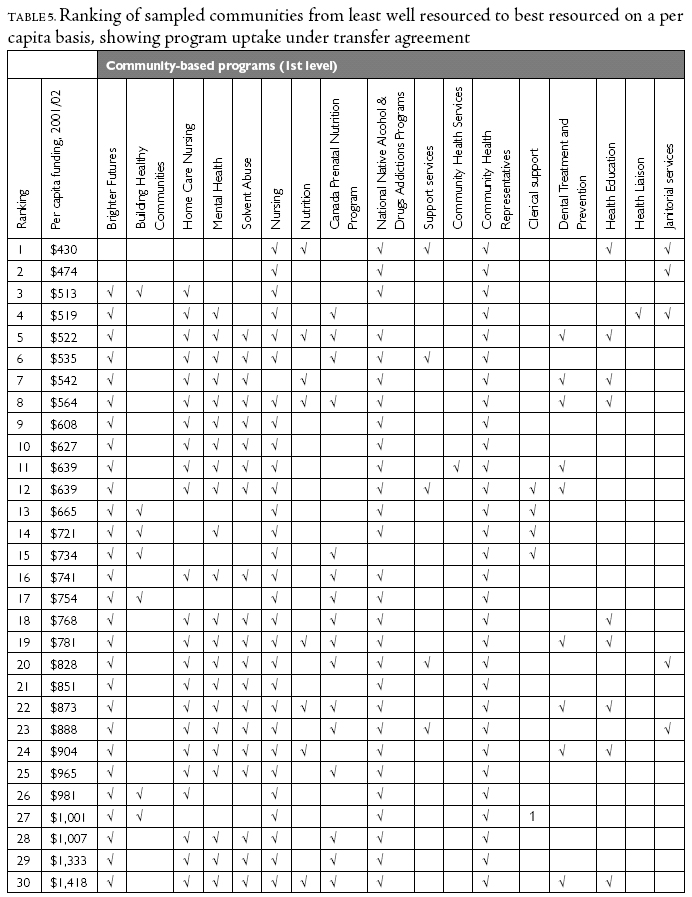 In theory and based on the HTP, programs marked with a √ are those that were transferred to First Nations. Programs without a √ remain an FNIHB responsibility and are termed "residual roles." As shown, the level of funding per capita does not correspond with the program uptake under the transfer agreement. While the range of per capita funding spans $430 to $1,418, better-resourced communities in fact were less likely to have assumed responsibility for second- and third-level services than communities resourced around $500 to $600 per capita. Program uptake could not be attributed to more specific community sizes or FNIHB region.