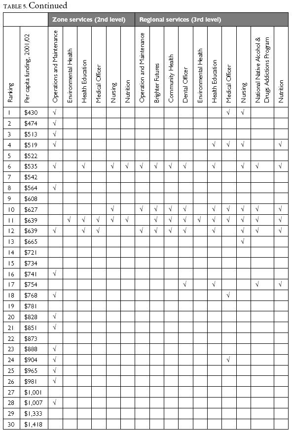 Table 5 shows program uptake for the 30 Health Centres included in Table 3. The first column represents the rank of each included community, based on per capita funding; column 2 reports per capita funding, and subsequent columns represent first- (community-based), second- (zone-based or supervisory) and third-level (regional or planning and advisory) services included in each transfer agreement.