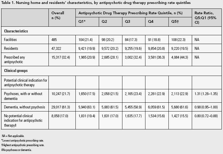 In a recent study, scientists at the Institute for Clinical Evaluative Sciences (ICES) explored the variation in the use of antipsychotic drugs across Ontario nursing homes. Nursing home residents aged 66 years and older on December 1, 2003, were identified, and a total of 47,322 residents in 485 provincially registered nursing homes across Ontario were included in the study. The percentage of residents who were dispensed antipsychotic drugs at each nursing home was calculated. Nursing homes were then classified into quintiles (Q1-Q5), based on their mean facility-level antipsychotic prescribing rates, with Q1 being the quintile with the lowest mean prescribing rates and Q5 being the quintile with the highest. In addition, all residents were divided into three mutually exclusive clinical groups: two that were considered to have potential clinical indications for antipsychotic therapy (psychoses with or without dementia; dementia without psychoses) and a third group with no clinical indication for treatment. In this latter group, antipsychotic therapy would be considered inappropriate.