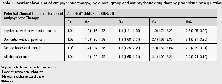 A total of 15,317 (32.4%) residents were dispensed an antipsychotic drug, while the average rate of prescribing ranged from 20.9 to 44.3%, in Q1 and Q5, respectively (Table 1). Relative to individuals residing in nursing homes with the lowest average prescribing rates, those residing in facilities with the highest rates were three times more likely to be dispensed antipsychotics (odds ratio, 3.0; 95% confidence interval, 2.77-3.16). This threefold higher rate persisted when adjustments were made for facility (size and setting) and resident characteristics (age, gender, comorbidities and total drug count; Table 2). The same pattern was seen within each clinical indication group, regardless of whether there was a potential clinical indication for the medications (see Table 2).