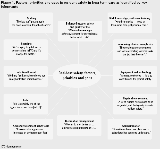 Key informants were selected so that the views of people in diverse groups (e.g., family members, front-line staff, researchers, policy makers and managers) from LTC settings across Canada would be captured. Fourteen key informants, identified by an advisory committee, participated in audiotaped, semi-structured telephone interviews. The purpose of the interviews was to identify safety issues in LTC. These interviews were transcribed verbatim, and a thematic analysis of the transcripts was conducted. Data were independently reviewed and coded, and 12 themes were developed. Factors, priorities and gaps in resident safety in LTC identified by key informants, as well as representative quotations, are provided in Figure 1.