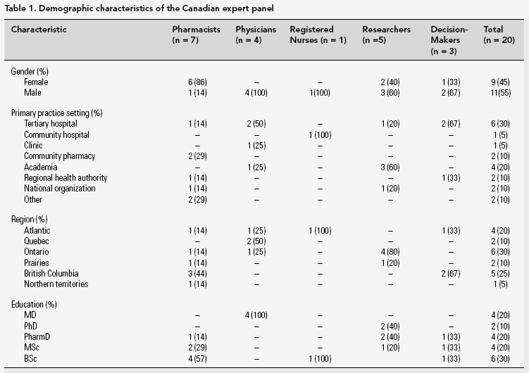 The co-investigators and the partnering national organizations - Canadian Council on Health Services Accreditation, Canadian College of Health Service Executives, Canadian Institute for Health Information, Canadian Pharmacists Association, Canadian Society of Hospital Pharmacists and the Institute for Safe Medication Practices Canada - were responsible for identifying nationally recognized experts in the safety of the medication-use system. An attempt was made to ensure that the panel had representation from across the country and from a variety of health professions and backgrounds. The 20 potential panellists who were identified were initially contacted by e-mail; they received a brief description of the study and what would be required of participants. Panellists were selected based on their experience, willingness to participate and availability. All 20 potential panellists asked agreed to participate; the target size of 20 people was governed by resource constraints. The panel consisted of experts in medication safety representing medicine, nursing, pharmacy, research and decision-makers in hospital and community settings across Canada (Table 1).