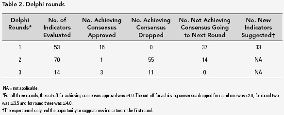 Consistent with the Delphi technique, surveys were individually tailored so that each respondent received his or her score for each indicator on the previous round as well as the mean score of the group. The cut-offs for rounds one, two and three were >4.0 (agree or strongly agree) for achieving consensus approval. The cut-off for achieving consensus dropped for round one was <2.0, for round two was # 3.5 and for round three was # 4.0. The rationale for the standard for achieving consensus dropped is outlined in the results.