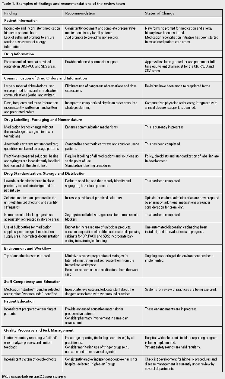 On March 15 and 16, 2005, an interdisciplinary team of consultants from ISMP Canada, along with a representative from the US-based ISMP, performed a targeted system review of medication use in the OR and related patient care areas at the hospital. The review team observed the environments in which medications were prescribed, stored, transcribed, prepared, dispensed and administered. Areas of direct observations included the same-day surgical ward, individual ORs and the post-anesthesia care unit. Physicians (surgeons and anesthesiologists), nurses, respiratory therapists, perfusionists, pharmacy technicians, educators and representatives from surgical management were interviewed. The team also toured the pharmacy. Various supporting documents (e.g., protocols, policies, procedures, order sets, drug guidelines, error reports and educational materials) were reviewed during the assessment process. System weaknesses were identified, and 75 specific recommendations were made to enhance medication safety.