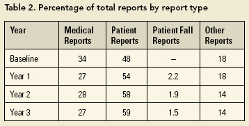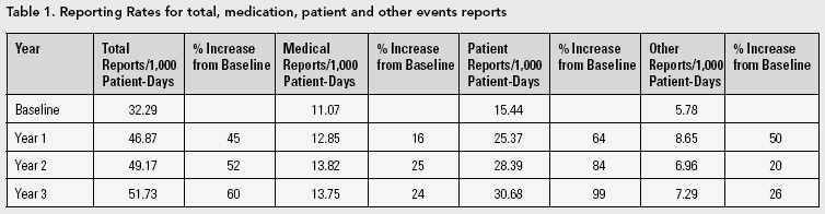 Since the introduction of the safety reporting system, the rate of safety reporting has increased dramatically. Table 1 outlines the rates of reporting (adjusted to 1,000 patient-days) for all reports and for breakdowns into medication, patient and other reports. Reporting periods include the baseline year (the 12 months preceding the change) and each of the three years following system implementation. As can be seen, our rates exceed the median of 35 reports per 1,000 patient-days generated by 26 acute care centres (range nine to 95) across the United States using an electronic error reporting system, as reported by Milch et al. (2006).