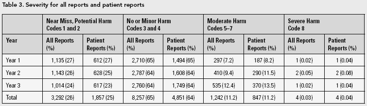 Table 3 outlines the breakdown of events by severity code for the three years of system use and the overall average for all events and patient events. This breakdown compares with that in the Milch et al. (2006) study: 13% near miss, 67% no harm, 32% temporary harm, 0.8% life-threatening or permanent harm and 0.4% contributing to patient death. Another study reports a 25% near-miss rate (Taylor et al. 2004).