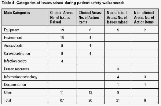 Since January 2006, we have performed and analyzed 15 PSWs, 13 in clinical areas and two in non-clinical areas (pharmacy and medical engineering). Table 4 summarizes the categories of concerns raised and the types of concerns prioritized for improvement. As expected, the concerns in the clinical and non-clinical areas differed.