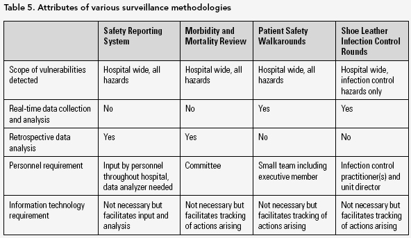 Table 5 applies many of these considerations to the four methods of surveillance we use at SickKids.