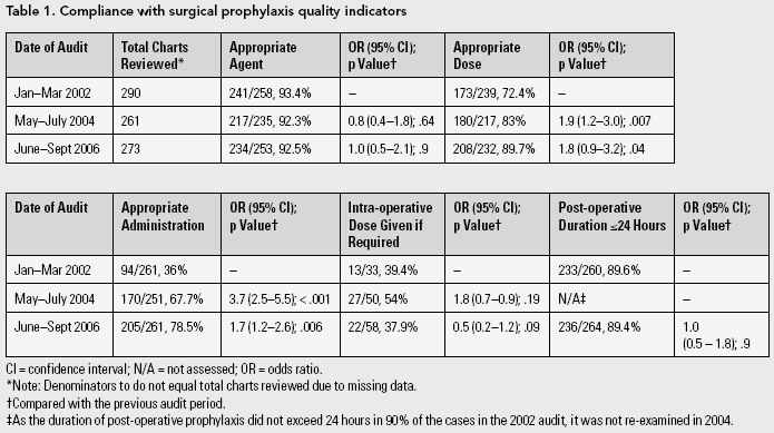 Quality indicators for antibiotic surgical prophylaxis were derived from the current literature (American Society of Health-System Pharmacists 1999; "Antimicrobial Prophylaxis in Surgery" 2001; Auerbach 2001; Dellinger et al. 1994; Forse et al. 1989; Mangram et al. 1999; Scottish Intercollegiate Guidelines Network 2000; Swoboda et al. 1996; Zanetti et al. 2001). A baseline audit was performed between January and March 2002 to assess compliance with the quality indicators in five surgical divisions (Orthopedic, Neurosurgery, Vascular, Thoracic and General Surgery). As part of the continuous quality improvement process, the antibiotic prophylaxis quality indicators were prospectively re-evaluated between May and July 2004 and between June and September 2006. For each audit, a convenience sample of approximately 50 patient charts per division were reviewed.
