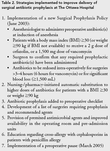 Following the baseline audit, a multidisciplinary team was formed to review the institution's process for antimicrobial prophylaxis and to make recommendations for improvement. Members included the antimicrobial pharmacist, the clinical director, clinical managers and nurse educators for peri-operative services, the pharmacy operations manager and physician representatives from surgery, anesthesiology and infection prevention and control. The working group recommended that the preoperative antibiotics be administered by the anesthesiologist at the induction of anesthesia (with the exceptions of vancomycin and clindamycin due to their longer administration times). Orders written as "preop" or "on call to OR" were to be understood as indicating that the antibiotic was to be administered in the operating room (OR) as per this new protocol. To facilitate delivery, premixed preoperative doses of antibiotics were to be sent to the OR attached to a patient's chart and were also made readily available in the OR suites. These interventions, along with additional practice changes to facilitate the process (Table 2), were implemented in June 2003.