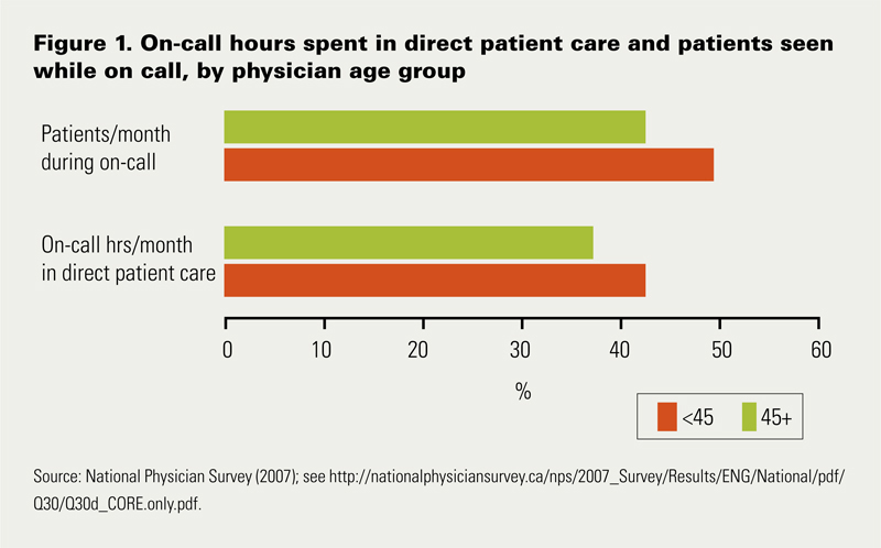 The 2007 National Physician Survey shows that 70% of physicians are on call each month. Slightly fewer female and family physicians are on call compared with male physicians and other specialists. A higher proportion of physicians under the age of 45 take on-call duty, see more patients while on call and provide more patient care than do those over 45 years. But the older doctors – both family physicians and other specialists – are on call for more hours each month than are their younger colleagues. Physicians in group or inter-professional practices are more likely to have on-call responsibilities, but they do fewer hours each month than do those in solo practice.