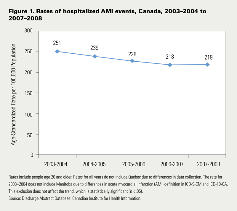 A 2009 report (Health Indicators 2009) by the Canadian Institute for Health Information (CIHI), in collaboration with Statistics Canada, provides new information relating to heart attacks. For the first time, it shows rates of admissions to acute care hospitals for new heart attacks. This statistic is more refined than hospitalization rates, which include those people who went into hospital two or more times for the same heart attack or who were transferred to another hospital and were counted more than once. The report also provides information on pan-Canadian angioplasty and bypass surgery rates, the 30-day AMI in-hospital death rate and the rate of unplanned readmissions following discharge from hospital for a heart attack. This article highlights some of the key findings from the report.