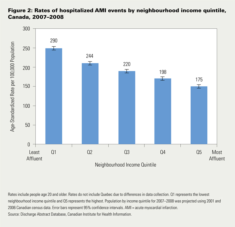 The likelihood of having a heart attack is inversely associated with socio-economic status and the gaps between the socio-economic groups are increasing. Trends show a significant decline in new hospitalized heart attack rates for all socio-economic groups. However, the decrease was greater for those who lived in the most affluent neighbourhoods (–17%) compared with those in the least affluent neighbourhoods (–10%) during the five-year study period.