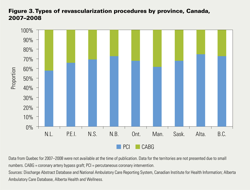 Overall, the cardiac revascularization rate (i.e., the rate of PCI and CABG combined) has increased by 39%, after age and population growth are taken into account. The types of revascularization procedures used vary across the provinces. For example, angioplasty procedures were used most in New Brunswick, Alberta and British Columbia and least in Newfoundland and Labrador, Manitoba and Prince Edward Island (Figure 3). These differences may be due to the population health needs or practice patterns within a given geographical area.