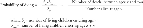 We constructed the life table for a total of 23,184 births of second and higher order for which the length of the preceding birth interval and age at death or survival to third birthday of the index child were known, where the index child is succeeding child. We selected children whose previous sibling had already died before the succeeding conception, yielding a sample size is 5049. Conventional life tables are used to provide an overall idea of influence of birth spacing on child survival. The tables are based on probability of dying and survival up to 3 years, that is, third birth day. In calculating the probability, the numerators are the numbers of children dying and the denominators are the number of children entering each age group. The ratios are, therefore, probabilities of death.