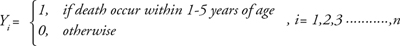 where, π1 in this case is the probability of death or survival of a child, and βi is the parameter estimated for the intercept and independent variables. The results of logistic regression analysis are given as coefficients, odds ratios (if greater than unity, the probability of surviving rather than dying), and P values, to assess the relative importance of the selected variables.