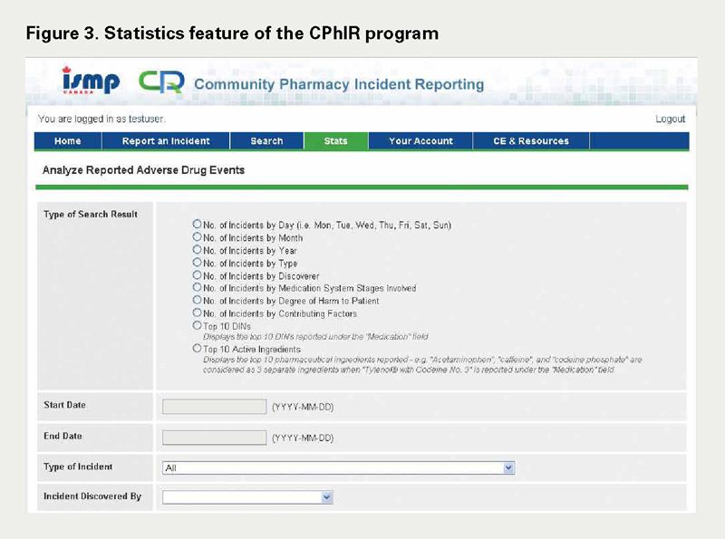 The CPhIR program aligns with the above core concepts. CPhIR was built to learn from failures in the system processes of community pharmacies. It is a special program made to accommodate the unique setting of the community pharmacy. The second concept states that reporters must feel safe using a reporting program. In the CPhIR program, (1) data are transmitted to ISMP Canada securely and anonymously so that no blame can be associated to the reporter(s) at the community pharmacy; and (2) a no-blaming culture is encouraged internally at the community pharmacy so that no individual staff member is punished. The WHO guidelines suggest that a meaningful analysis must be completed to understand how errors occur and what recommendations can be made to improve the system. CPhIR includes features that can assist individual community pharmacy in these analyses by allowing the user to generate descriptive statistics (such as frequency tables and graphs) on the mandatory data elements listed in Table 2 via the Stats function (see Figure 4) when users login with their unique username and password. Finally, the "agency" referred in the WHO guidelines is ISMP Canada. All reported medication incidents will be transmitted to the ISMP Canada national incident database, where experts in the medication safety field can analyze the incidents, make recommendations and disseminate findings and learning to healthcare practitioners in Canada. The ISMP Canada Safety Bulletins (available at https://www.ismp-canada.org/ISMPCSafetyBulletins.htm) and the anticipated communication platform in CPhIR will be the means to fulfill the notion of the dissemination of recommendations and development of solutions.