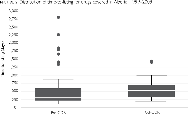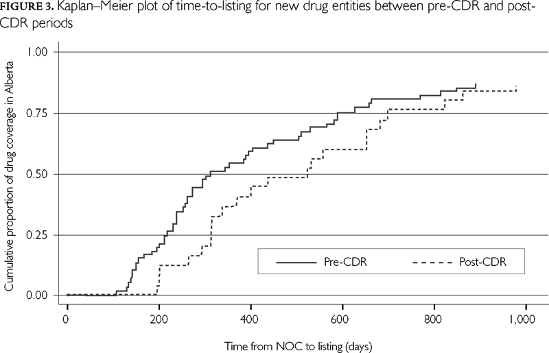 Results: Two hundred and twenty new drugs were identified and met the study eligibility criteria (118 pre-CDR, 102 post-CDR). The median time-to-listing was 312 vs. 524 days in the pre-CDR and post-CDR periods, respectively, with the difference largely driven by time from notice of compliance (NOC) to the CDR recommendation. The level of agreement between 73 drugs with CDR recommendations and coverage in Alberta was fair (kappa 0.55).