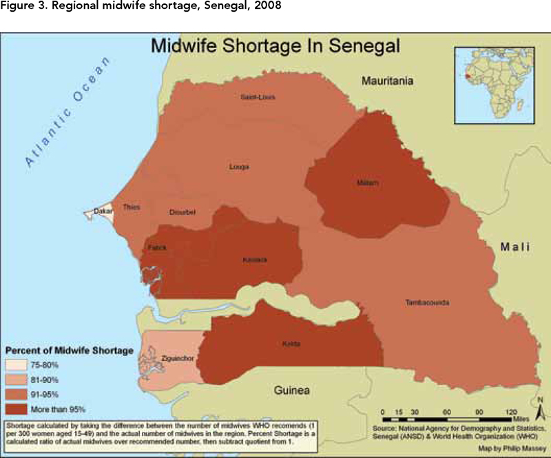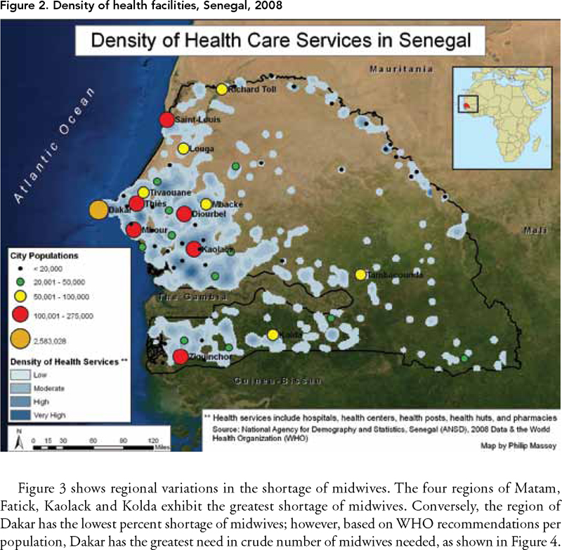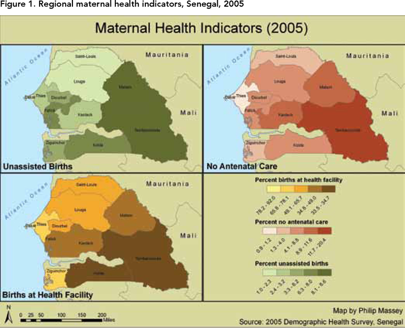 Community health profiling using GIS can be an invaluable asset for policy makers, public health officials and community development projects to show resources and need based on geographic areas (Maclachlan et al. 2007). Examining maternal health indicators and the current distribution of human resources for health in Senegal through a community health profile lens may provide important information for policy development and targeted intervention. Specifically, results from this investigation can help inform both governmental and non-governmental agencies on the allocation of resources to best mitigate regional disparities (Maclachlan et al. 2007). In an effort to prioritize midwife service expansion, GIS is used to describe and examine the relationship between the spatial distribution of human resources for health and regional variations in maternal health outcomes in Senegal.